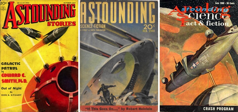 His real mark on the field was as an editor. He was selected to lead Astounding Stories magazine in 1937, and quickly changed its name to Astounding Science-Fiction, the first of a number of changes that eventually led to the name Analog Science Fiction and Fact. The first decade after he joined the magazine is sometimes referred to as the “Golden Age of Science Fiction,” as Astounding became the most influential science fiction magazine of its time. While other magazines like Thrilling Wonder Stories, Startling Stories, Planet Stories, and Captain Future continued to pump out lurid pulp stories of “scientifiction,” Campbell promoted a more thoughtful and mature approach. He bought the first science fiction stories from a number of future greats, including A. E. van Vogt, Robert A. Heinlein, and Theodore Sturgeon, and paid on acceptance to attract the top talent. Other authors who appeared in the magazine during the period included Isaac Asimov, L. Sprague de Camp, L. Ron Hubbard, Henry Kuttner, Murray Leinster, C. L. Moore, Lester del Rey, Clifford D. Simak, E. E. Smith, and Jack Williamson. Science fact columns were a regular part of the magazine, with contributors like L. Sprague de Camp, R. S. Richardson, and Willy Ley.